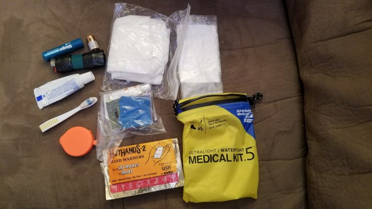 First aid kit is a .5 from adventure medical kits, it’s honestly more than I probably need but at under five ounces it’s hard to not just toss it in. I added a small tin with Vaseline soaked cotton balls and a small match book. This kit came in a little yellow bag and then inside that is a water proof bag filled with everything. The waterproof bag seemed the best place to leave some last chance fire starting pieces. To check out all the pieces supplied in the .5 kit and all the other kits offered check out their website HERE.