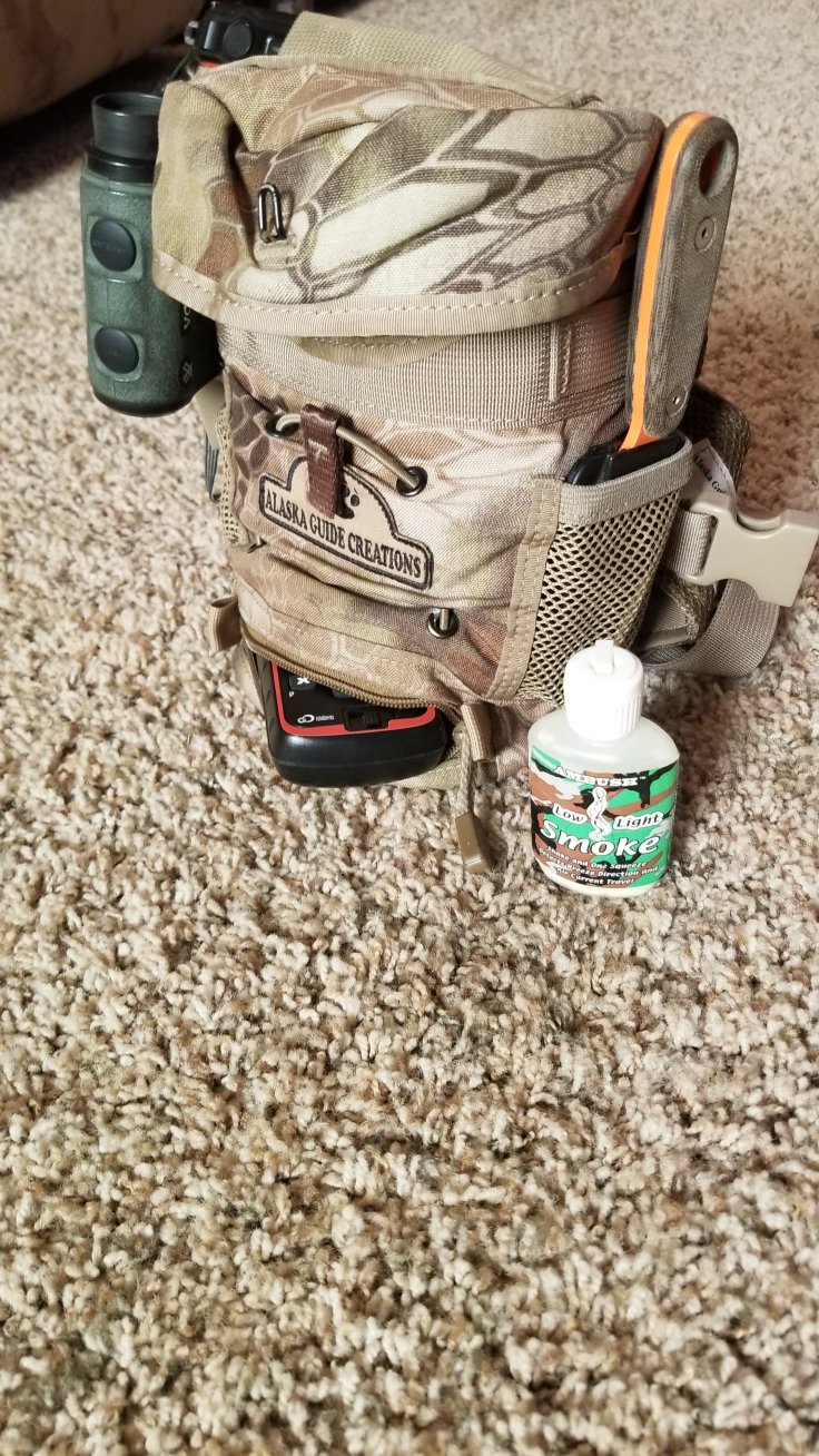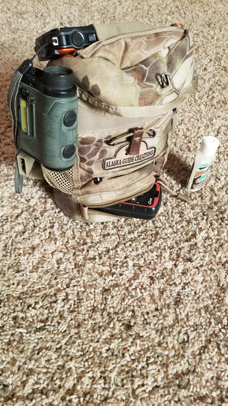 Obviously my Leupold 10x42s go in the main pouch and stay there when not in use, I do not run the tethers supplied by AGC. One side pouch is holding a lens cleaning cloth on the other is an izula 2 fixed blade knife or occasionally my leatherman. In the back zippered pocket I have applicable maps and all tags for the year as well as some medical super glue tubes and a pic of my wife. The basement holds my inreach GPS and generally a small amount paracord or guy line.